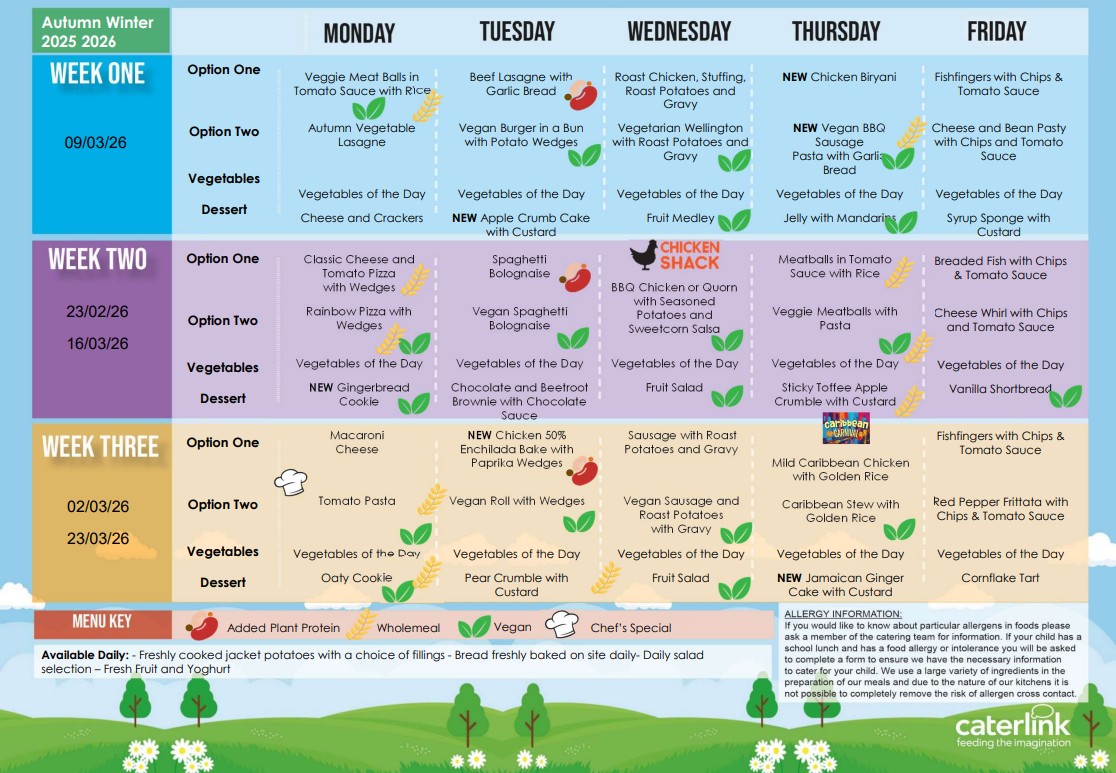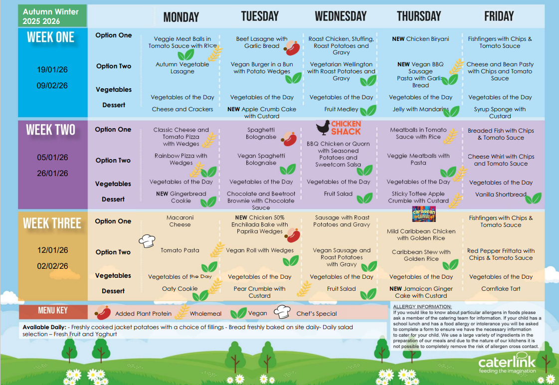 Please note: On school census days, Thursday & Friday menu options will be swapped. You will be able to order your child's preference via School Money in the usual way. Census days are in October, January and May.