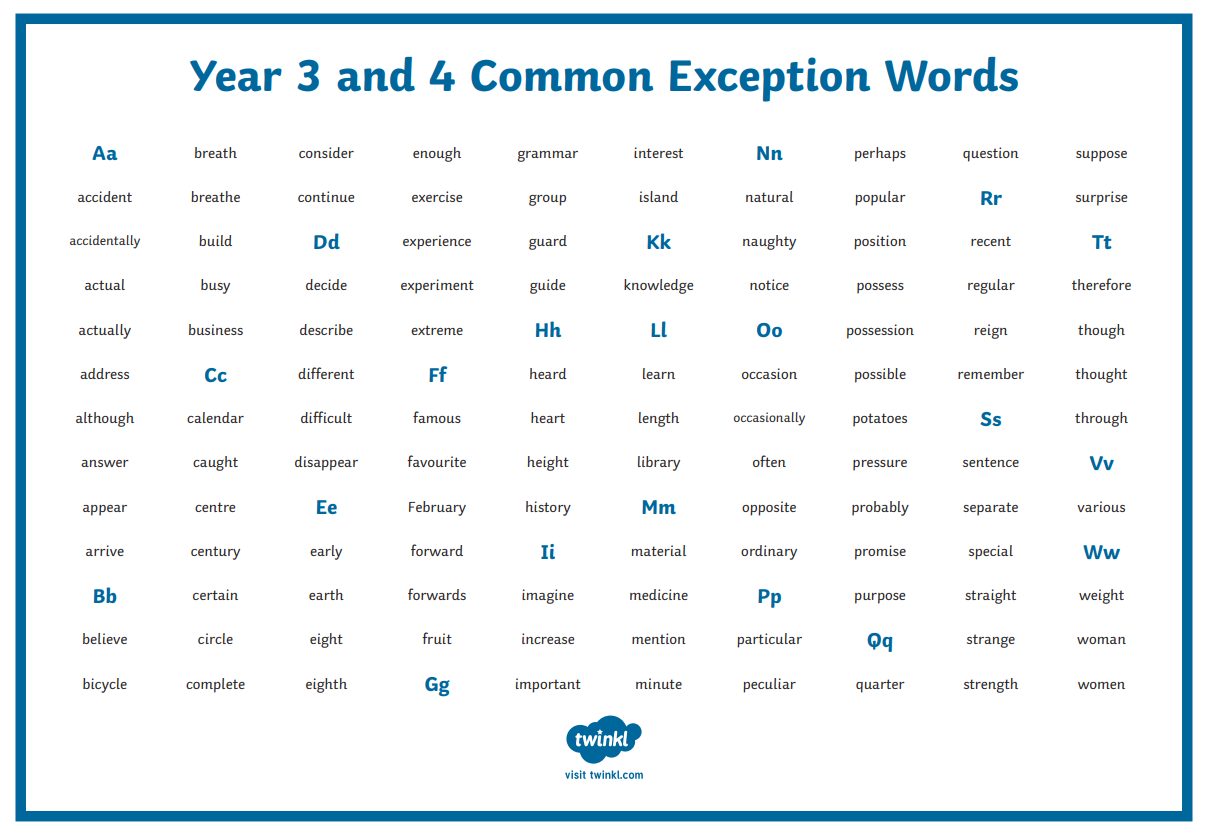 Common Exception Words for Years 3 & 4