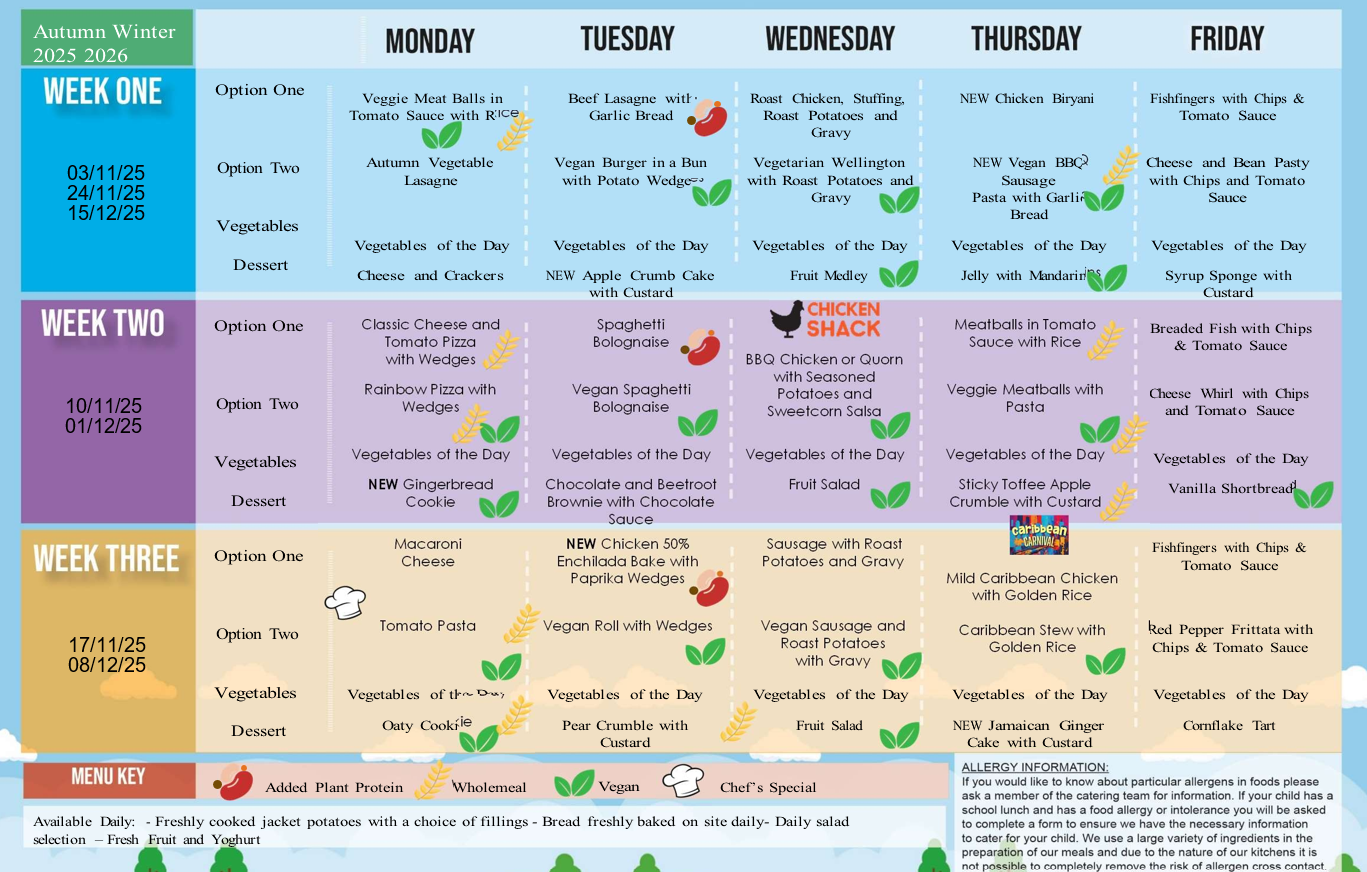 Please note: On school census days, Thursday & Friday menu options will be swapped. You will be able to order your child's preference via School Money in the usual way. Census days are in October, January and May.